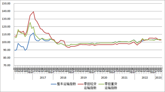 分車型指數看,各車型指數環比有所回落,同比去年小幅增長。以大宗商品及區域運輸為主的整車指數為103.4點,比上月回落0.18%,比上年同期增長1.91%。零擔指數中,零擔輕貨指數為102.7點,比上月回落0.15%,比上年同期增長3.26%;零擔重貨指數為103.3點,比上月回落0.18%,比上年同期增長1.96%。