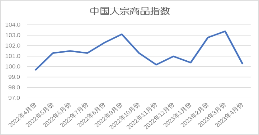 由中國物流與采購聯合會調查、發布的2023年4月份中國大宗商品指數(CBMI)為100.3%,較上月回落3.1個百分點,指數在連續兩個月上升后出現回落。各分項指數中,供應指數、銷售指數雙雙回落,且供應指數跌幅更大,庫存指數觸底回升。從本月指數的變化情況來看,歷來3至4月份都是傳統消費旺季,而今年在“金三”強勢出現后,“銀四”跟隨的步伐明顯放緩,顯示當前國內經濟仍處于恢復進程,在存量需求釋放后新增需求不足,市場需求并未如預期般繼續恢復。但從指數變化來看,反映當前市場需求是擴張態勢回落,這主要是前幾個月持續回升帶來的高基數效應,國內需求在各項穩投資促消費政策的貫徹落實下仍有穩定基礎。與此同時,隨著商品價格整體下挫,生產企業利潤收縮,產品產量減少,市場供應增速放緩,供需銜接仍顯均衡,所以本月市場庫存整體仍呈現下降趨勢,僅是降幅收窄。從各項經濟數據情況來看,我國宏觀經濟運行開局良好,經濟恢復趨勢明確,以消費和投資為代表的內需仍有進一步恢復的空間。隨著居民收入反彈和消費者信心逐漸修復,預計與經濟重啟相關的消費活動價格將進一步上升,包括餐飲、外出、旅行、娛樂和居民服務等等。同時,隨著房地產市場企穩和金融支持效果進一步顯現,消費需求有望進一步回暖,預計5月份國內大宗商品市場將迎來穩中回升的態勢,整體商品價格或將溫和反彈。