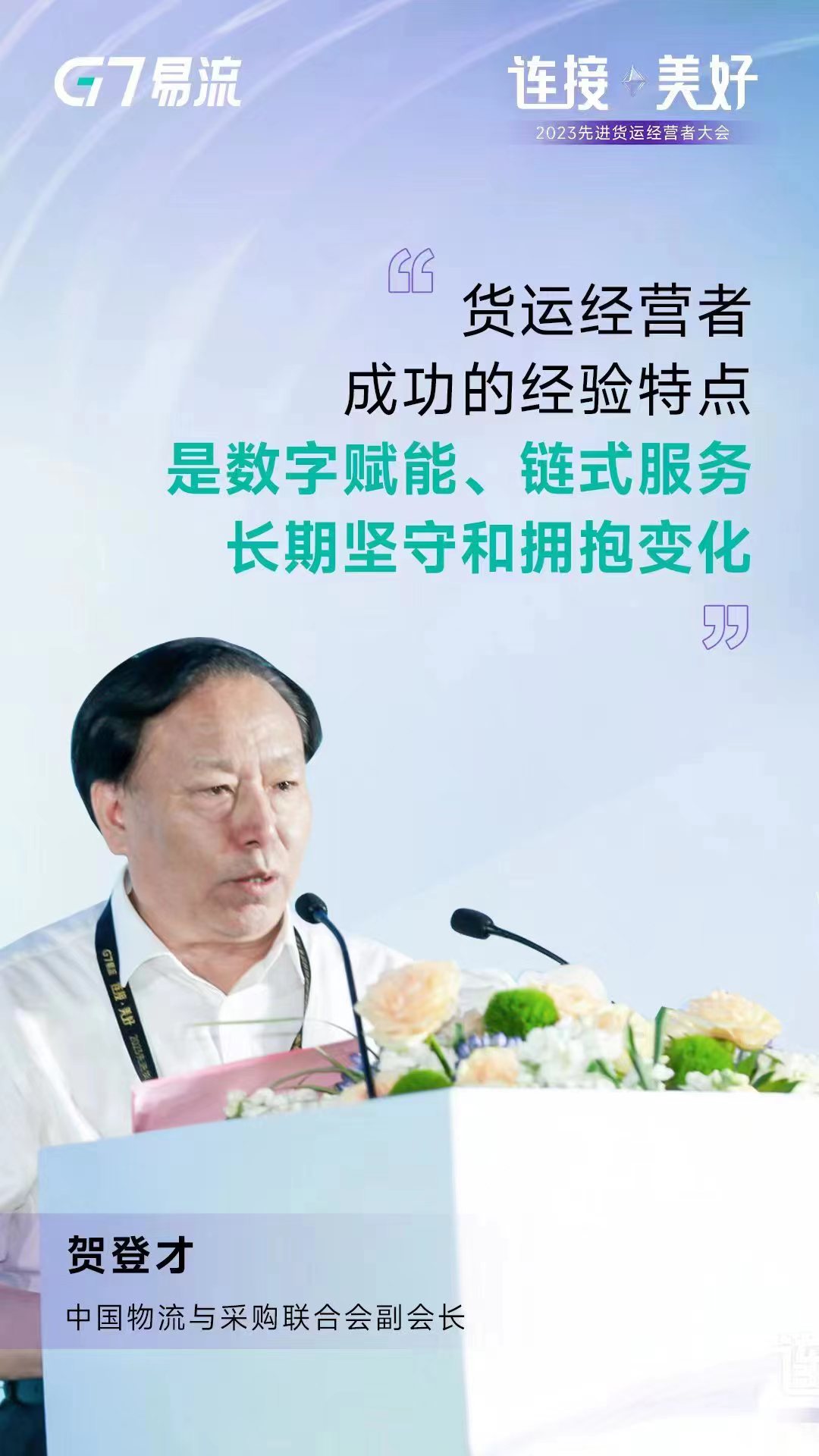 很高興在這五彩繽紛的五月來到上海,同大家一起參加2023 先進貨運經營者大會。首先,我代表中國物流與采購聯合會公路貨運分會,向本次大會順利召開以及進入先進貨運經營者行列的100家企業表示熱烈的祝賀;向G7易流推動行業數字化轉型所做的貢獻給予由衷的點贊;向千萬貨運經營者和你們的家人表示親切的慰問。大家辛苦了!