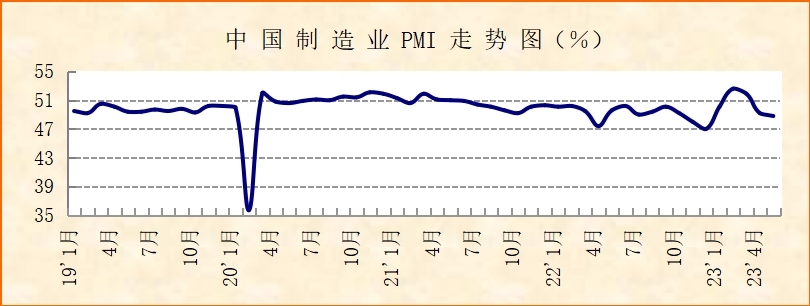 中國物流與采購聯合會、國家統計局服務業調查中心發布的2023年5月份中國制造業采購經理指數(PMI)為48.8%,較上月下降0.4個百分點,連續2個月運行在50%以下。分項指數變化顯示,經濟恢復動能有所不足,企業生產活動放緩,市場價格持續下降,傳統行業加快下行,新動能趨穩回升,新舊動能加快轉換。