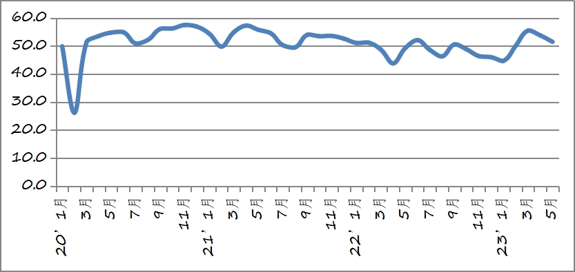 中國物流與采購聯合會發布的2023年5月份中國物流業景氣指數為51.5%,環比回落2.3個百分點。分項指數大部分指標回落,但業務總量指數、庫存周轉次數指數、資金周轉率指數、設備利用率指數、固定資產投資完成額指數、業務活動預期指數等關鍵指標均處于景氣區間,反映出當前物流運行仍處于反彈式回升向內生性增長的轉換階段,需求回調、增長波動在預期之內。但也要關注波動帶來的新增需求放緩、勞動力需求收縮以及小微企業生存困境等問題。