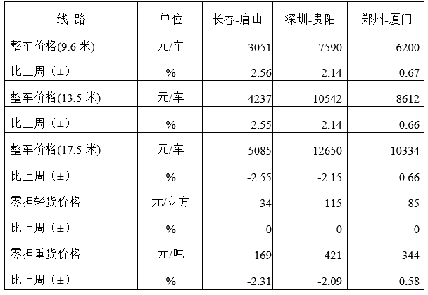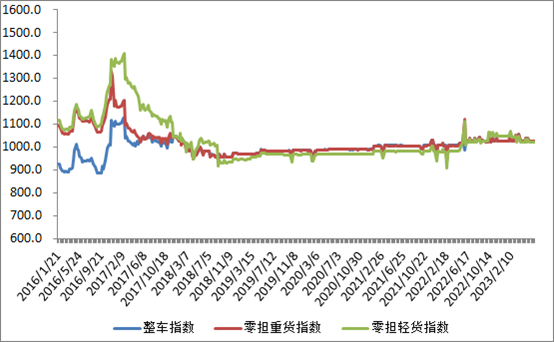 分車型看,各車型指數環比漲跌互現。其中,整車指數為1024.22點,比上周回落0.04%;零擔輕貨指數為1020.35點,比上周回落0.03%;零擔重貨指數為1024.72點,比上周回升0.04%。