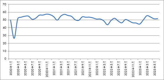 中國物流與采購聯合會發布的2023年6月份中國物流業景氣指數為51.7%,環比回升0.2個百分點。分項指數均有所回升,反映需求的業務總量指數、新訂單指數小幅回升,庫存周轉次數指數、資金周轉率指數、設備利用率指數繼續保持在景氣區間,從業人員指數再次回升到50%以上,固定資產投資完成額指數、業務活動預期指數等信心關聯指標均處于景氣區間,企業預期保持穩中向好。