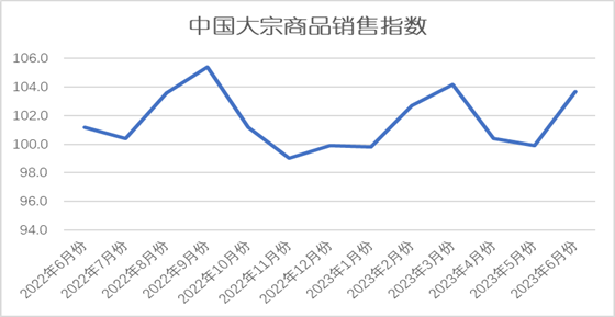 2023年6月份,大宗商品銷售指數止跌反彈,當月較上月回升3.8個百分點,至103.7%,顯示下游行業復蘇跡象明顯,市場訂貨積極性高漲,企業訂單組織順暢。不過,值得注意的是,本月指數明顯回升,是建立在前期基數較低的基礎上,實際上需求回升仍較為溫和,特別是6月下旬以來,受高溫多雨天氣影響,需求淡季效應顯現,市場情緒再度趨于謹慎。從各主要商品的情況來看,本月各商品銷售量較上月均有增加,其中,鋼鐵、鐵礦石和煤炭銷售量止跌回升,有色金屬、化工和汽車銷售量繼續增加,且增速加快,成品油銷售量雖連續七個月增加,但本月受柴油需求下滑以及基數較高的影響,銷售增速略有減緩。