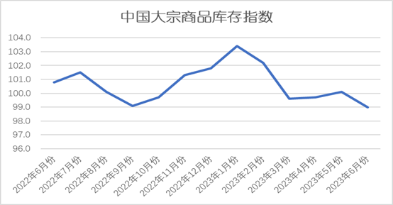 2023年6月份,大宗商品庫存指數為99.0%,指數在上月回升后,再度下跌,且跌至2021年6月份以來的最低,顯示由于近期國內大宗商品市場供需兩旺,供求關系明顯改善,商品庫存持續減少,市場庫存壓力繼續緩解。各主要商品中,鋼鐵、鐵礦石庫存量繼續下降,有色金屬庫存量由升轉降,化工和汽車庫存量雖有增加,但增速有所放緩,煤炭和成品油受生產企業持續復產的影響,庫存量繼續增加,且增速繼續加快。