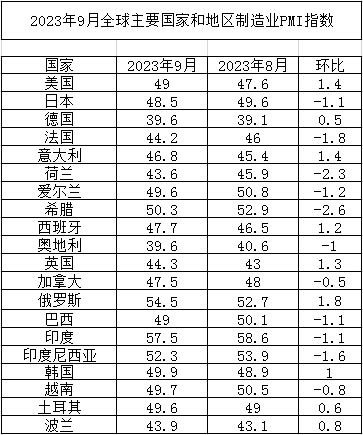 2023年9月份全球主要國家制造業PMI