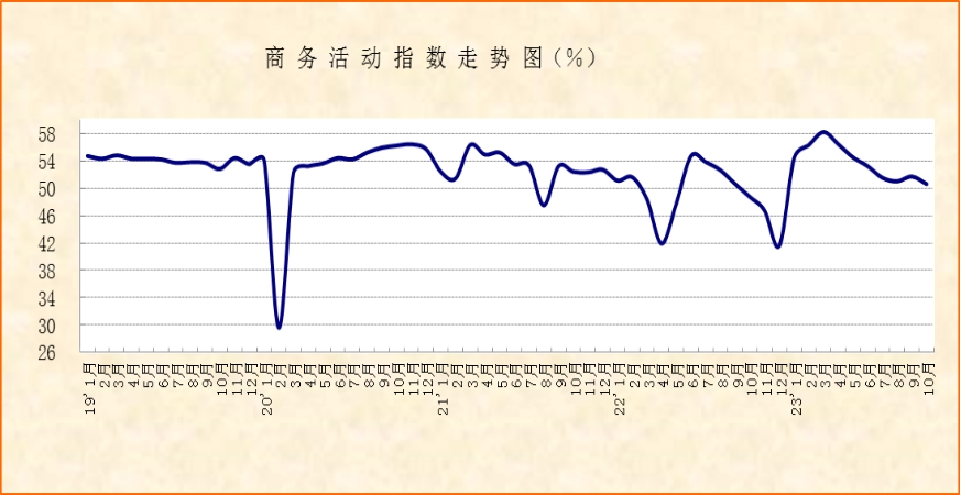 中國(guó)物流與采購(gòu)聯(lián)合會(huì)、國(guó)家統(tǒng)計(jì)局服務(wù)業(yè)調(diào)查中心發(fā)布的2023年10月份中國(guó)非制造業(yè)商務(wù)活動(dòng)指數(shù)為50.6%,較上月下降1.1個(gè)百分點(diǎn);新訂單指數(shù)為46.7%,較上月下降1.1個(gè)百分點(diǎn)。批發(fā)業(yè)和金融業(yè)增速回落導(dǎo)致非制造業(yè)增速放緩,節(jié)日拉動(dòng)效應(yīng)回歸常態(tài)化,基建投資活動(dòng)穩(wěn)定發(fā)力,企業(yè)預(yù)期相對(duì)穩(wěn)定,市場(chǎng)需求仍需繼續(xù)提升。