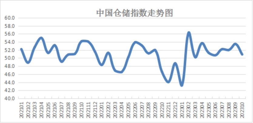 中國物流與采購聯合會和中儲發展股份有限公司聯合調查的中國倉儲指數,2023年10月份為50.9%,較上月下降2.6個百分點,連續九個月保持在擴張區間。指數回落主要受前期基數較高影響,但運行在擴張區間,表明行業仍保持平穩發展態勢。業務量、設施利用率、期末庫存、平均庫存周轉次數、業務活動預期等分項指數均在擴張區間有所回落。具體來看,本月指數有以下幾個特點:
