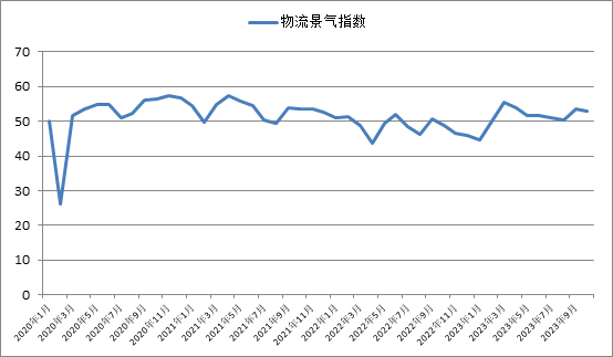中國物流與采購聯合會發布的2023年10月份中國物流業景氣指數為52.9%,環比回落0.6個百分點。10月份物流景氣平穩運行,東中西部地區發展相對均衡。宏觀層面需求指數和新訂單指數小幅回落,但仍處于擴張區間,企業微觀經營有所改善,資金周轉指數環比小幅回升,主營業務利潤基本持平,小微型企業經營繼續好轉。