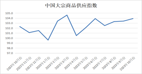 2023年10月份,大宗商品供應指數繼續上升,當月較上月上升0.5個百分點,至103.9%,指數三連升至近四個月以來的最高。從目前商品供應端的情況來看,利潤、需求和預期是企業生產的主要推手,導致各商品供應狀況略有不同。從8月份開始,隨著傳統消費旺季的來臨,加之國內經濟和制造業的復蘇,市場需求持續回暖,商品生產企業對后市預期良好,生產熱情高漲,與此同時,物流行業整體平穩運行,也令生產企業原材料的供應得到有效保障,給生產企業生產提供支撐,商品產量開始回升,本月大部分商品產量繼續回升,特別是生產企業對后市預期良好,生產熱情高漲,整體商品供應增速持續加快。各主要商品中,鐵礦石、煤炭、有色金屬和汽車供應量繼續增加,且增速加快,鋼鐵和化工供應量雖有增加,但受企業生產利潤收縮的影響,增速有所減緩,本月成品油受主營及地方煉廠開工率整體走低的影響,市場供應量自2022年6月份以來,首次出現下降的格局。