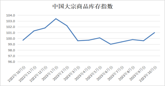 2023年10月份,大宗商品庫存指數止降回升至101.0%,較上月回升1.4個百分點,升至近八個月以來的最高點,整體商品庫存量在連續四個月減少的情況下,本月出現增加,顯示由于供應端增速持續加快,但終端需求有所減弱,市場供需出現失衡的局面,商品庫存開始積壓,庫存壓力有所顯現。從各主要商品庫存情況來看,鋼鐵和鐵礦石庫存量繼續減少,其余品種庫存量繼續增加,且增速加快。