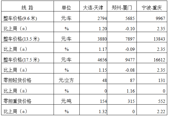 分車型看,各車型指數環比漲跌互現。其中,整車指數為1041.51點,比上周回落0.05%;零擔輕貨指數為1033.40點,與上周基本持平;零擔重貨指數為1041.48點,比上周回升0.05%。