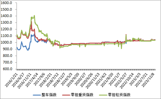分車型看,各車型指數環比漲跌互現。其中,整車指數為1041.76點,比上周回升0.02%;零擔輕貨指數為1033.53點,比上周回升0.01%;零擔重貨指數為1040.82點,比上周回落0.06%。