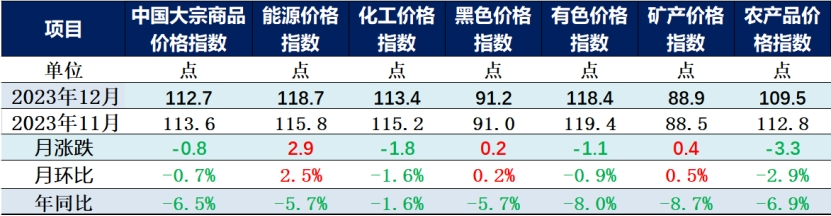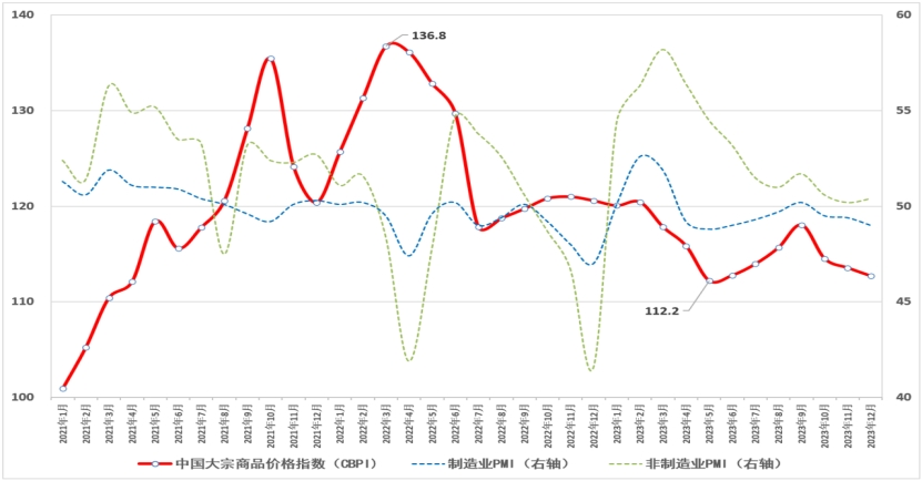 由中物聯大宗分會和上海鋼聯等單位聯合調查,中國物流與采購聯合會發布的2023年12月份中國大宗商品價格指數(CBPI)為112.7,較上月環比小幅回落0.7%,較去年同比下跌6.5%。從指數運行情況來看,盡管受世界經濟放緩擔憂、極端寒潮氣候、年底資金回籠等多方面因素影響,指數連續三月下跌,但仍高于年內低點,表明宏觀經濟運行整體相對穩定,多數企業對后市持樂觀預期。隨國家擴內需、促增長等各項措施政策持續發力,且制造業企業原材料成本壓力較去年同期明顯改善,預計市場價格整體下行空間有限,大宗市場回穩向好基礎進一步穩固。