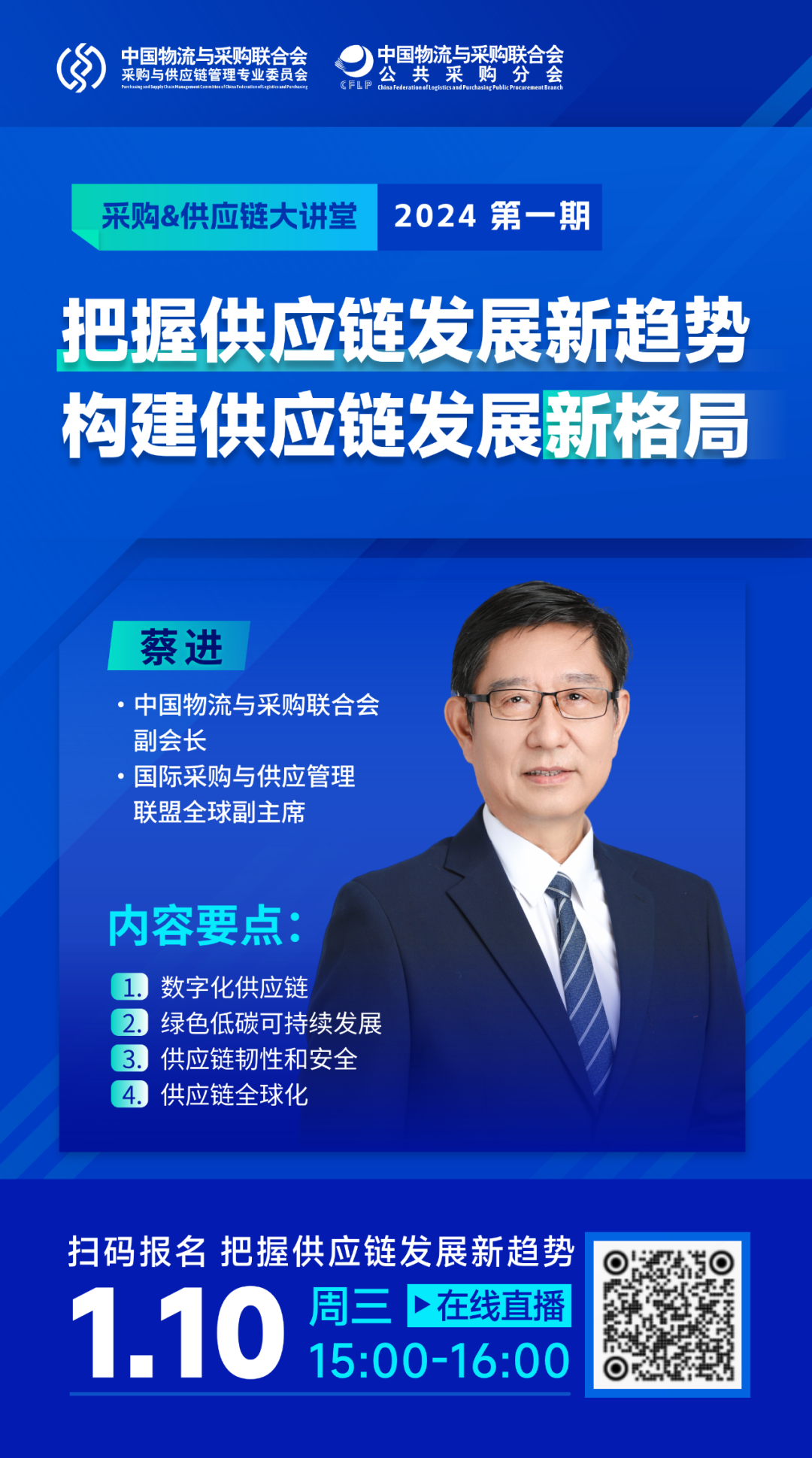 2024年1月10日,由中國物流與采購聯(lián)合會公共采購分會、采購與供應鏈管理專委會聯(lián)合主辦的“采購&供應鏈大講堂”2024年首期直播推出。中國物流與采購聯(lián)合會副會長蔡進出席并聚焦“把握供應鏈發(fā)展新趨勢 構建供應鏈發(fā)展新格局”主題,對數(shù)字化、綠色低碳可持續(xù)、韌性和安全、全球化等供應鏈發(fā)展趨勢進行了權威解讀。2000余名學員在線同步收看。
