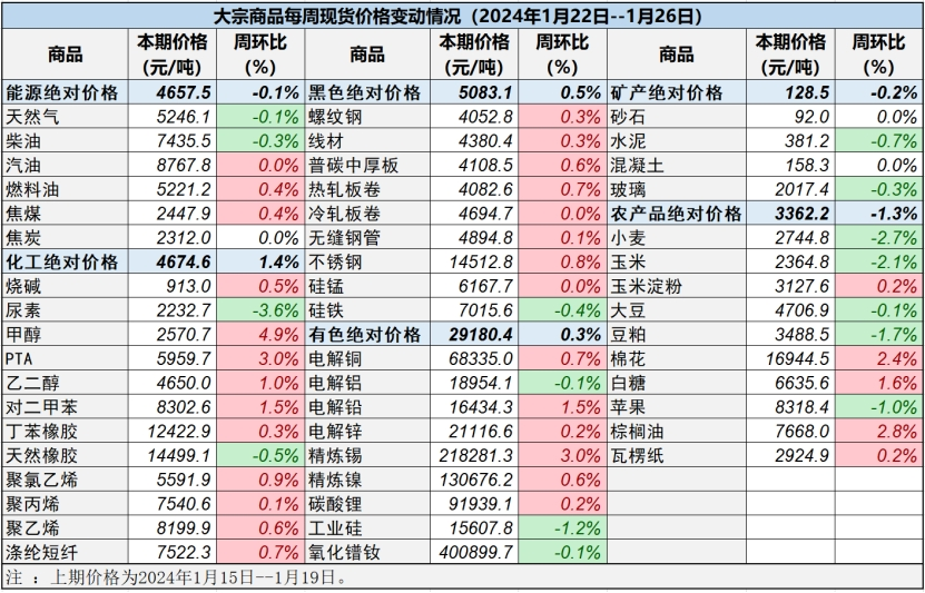 本表所示大宗商品價格(類別與產(chǎn)品規(guī)格說明見附表)為以人民幣計價的現(xiàn)貨價格(包含流通費用、利潤和稅費等)。計算這些價格時使用的信息來源,主要包括國內(nèi)重點地區(qū)的生產(chǎn)商、貿(mào)易商及下游消費企業(yè)之間的成交、詢報盤及可成交價格。價格單位為人民幣元/噸。