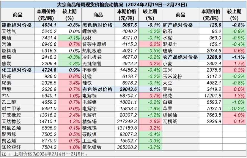據中國物流與采購聯合會對全國50種重要大宗商品市場價格調查顯示,本期價格(2024年2月19日至2月23日)與上期價格相比,25種(占比50%)大宗商品價格下跌,23種(占比46%)價格上漲,2種(占比4%)持平。