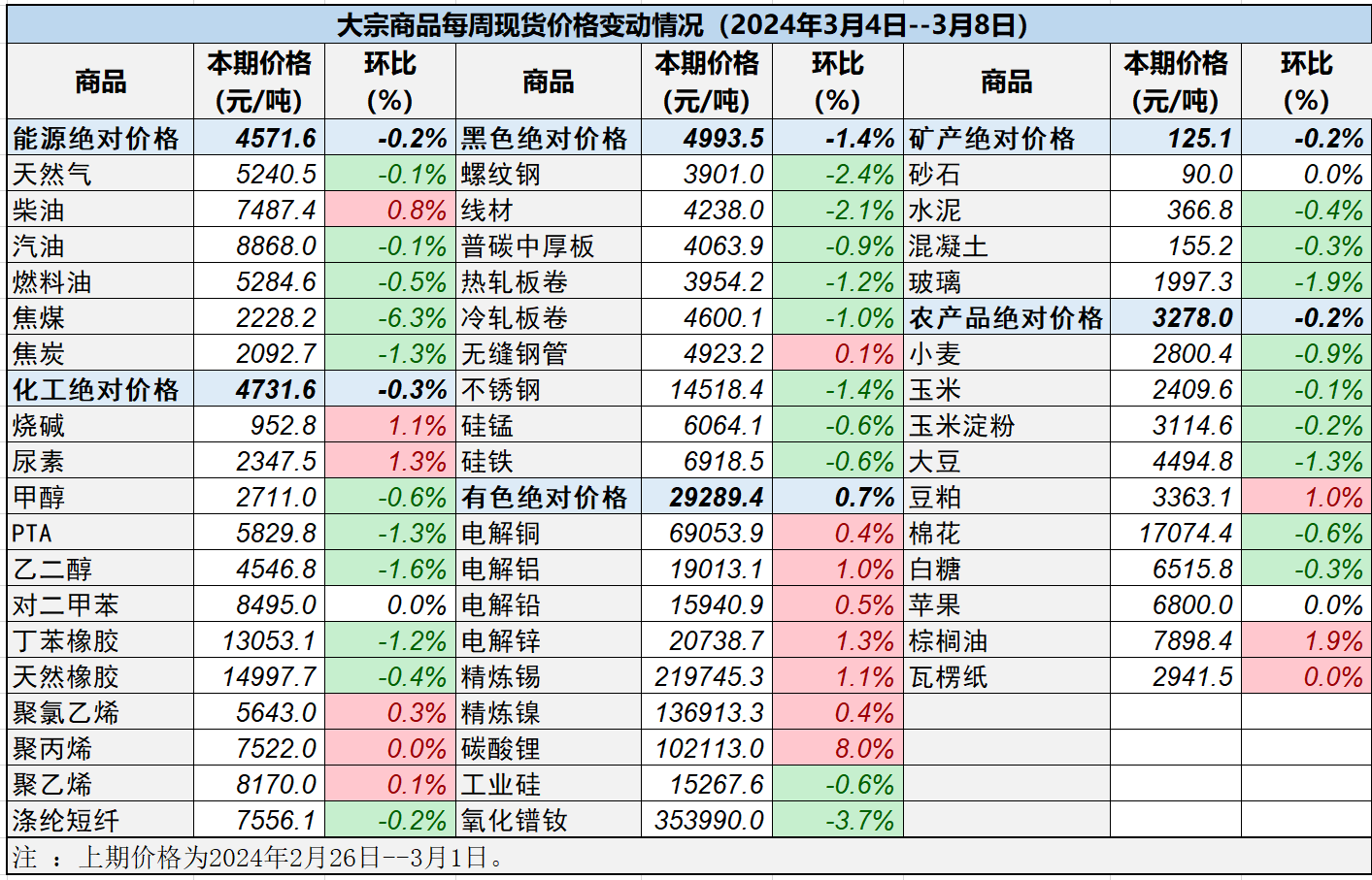 本表所示大宗商品價格(類別與產品規格說明見附表)為以人民幣計價的現貨價格(包含流通費用、利潤和稅費等)。計算這些價格時使用的信息來源,主要包括國內重點地區的生產商、貿易商及下游消費企業之間的成交、詢報盤及可成交價格。價格單位為人民幣元/噸。