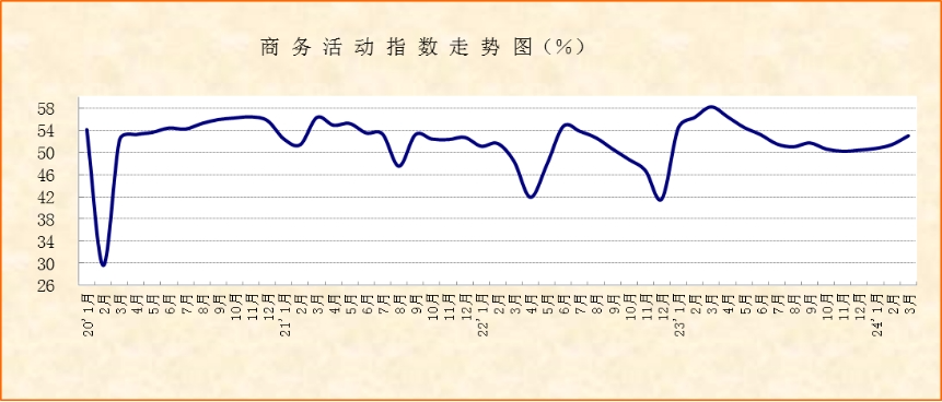 中國物流與采購聯(lián)合會、國家統(tǒng)計局服務業(yè)調(diào)查中心發(fā)布的2024年3月份中國非制造業(yè)商務活動指數(shù)為53%,較上月上升1.6個百分點,連續(xù)4個月上升,且升幅較上月繼續(xù)擴大,創(chuàng)出自去年7月以來的新高,顯示非制造業(yè)經(jīng)營活動在前幾個月蓄勢盤整基礎(chǔ)上加快增長。結(jié)合細分數(shù)據(jù)變化來看,經(jīng)濟相關(guān)活動加速啟動,新動能相關(guān)服務業(yè)保持活躍,融資環(huán)境繼續(xù)趨好,企業(yè)信心也有所增強。