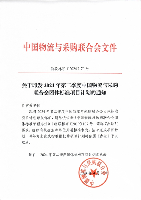中物聯(lián)印發(fā)2024年第二季度團(tuán)體標(biāo)準(zhǔn)項(xiàng)目計(jì)劃