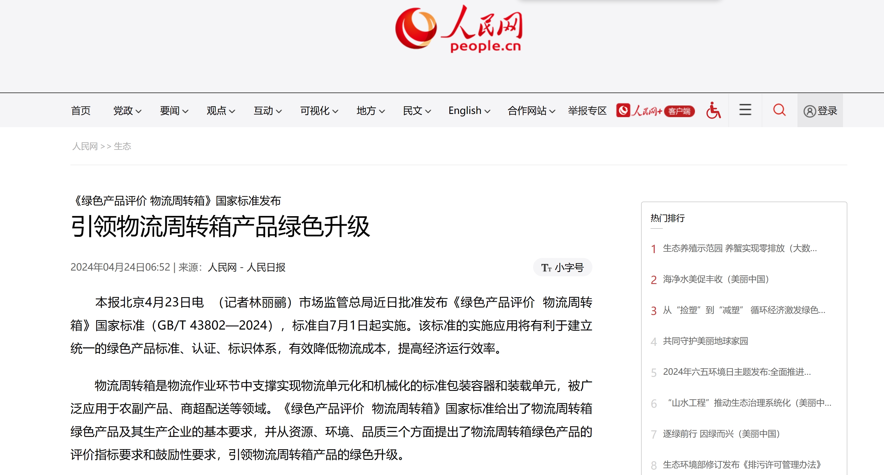 近日,《綠色產品評價 物流周轉箱》國家標準(GB/T 43802—2024)發布,《人民日報》、中央電視臺等多家央媒相繼進行了報道。