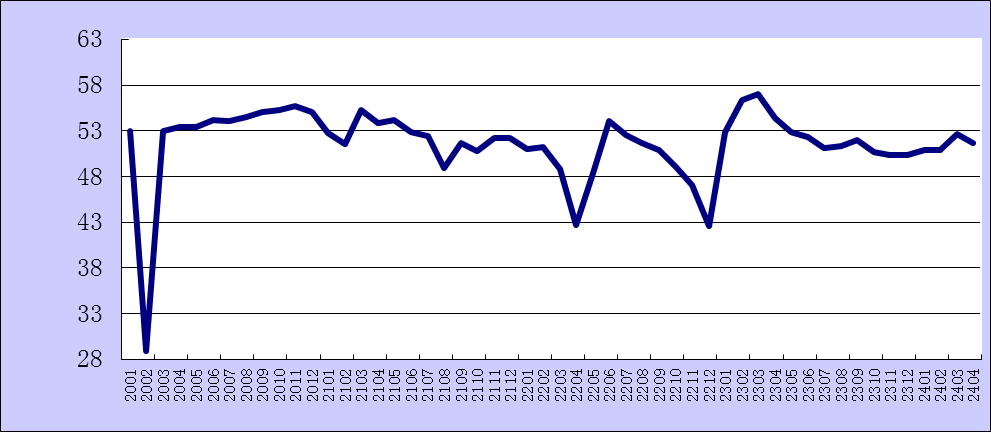 中國物流與采購聯合會、國家統計局服務業調查中心采購經理調查發布的2024年4月份綜合PMI產出指數為51.7%,較上月下降1個百分點。該指數是PMI指標體系中反映當期全行業(制造業和非制造業)產出變化情況的綜合指數,由制造業生產指數與非制造業商務活動指數加權求和而成,權數分別為制造業和非制造業占GDP的比重。