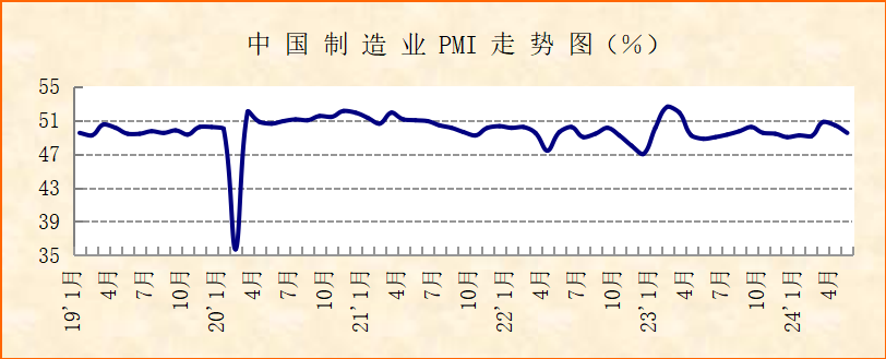 中國物流與采購聯(lián)合會、國家統(tǒng)計局服務(wù)業(yè)調(diào)查中心發(fā)布的2024年5月份中國制造業(yè)采購經(jīng)理指數(shù)(PMI)為49.5%,較上月下降0.9個百分點。從分項指數(shù)變化來看,5月份指數(shù)雖有所回調(diào),但經(jīng)濟(jì)穩(wěn)定回升仍具備基礎(chǔ)。