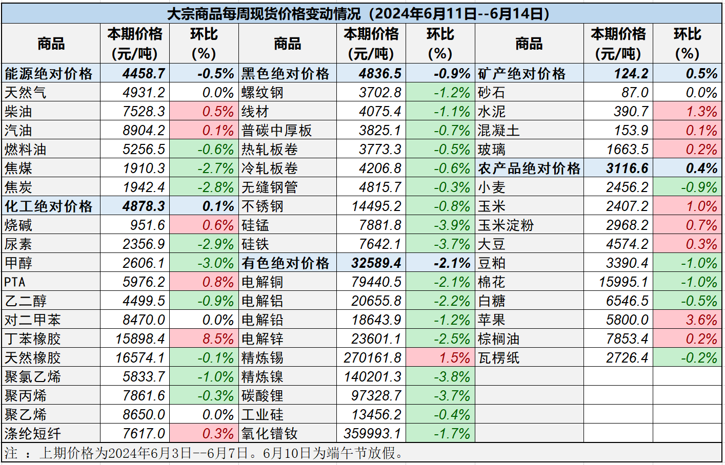 本表所示大宗商品價(jià)格(類別與產(chǎn)品規(guī)格說明見附表)為以人民幣計(jì)價(jià)的現(xiàn)貨價(jià)格(包含流通費(fèi)用、利潤和稅費(fèi)等)。計(jì)算這些價(jià)格時(shí)使用的信息來源,主要包括國內(nèi)重點(diǎn)地區(qū)的生產(chǎn)商、貿(mào)易商及下游消費(fèi)企業(yè)之間的成交、詢報(bào)盤及可成交價(jià)格。價(jià)格單位為人民幣元/噸。