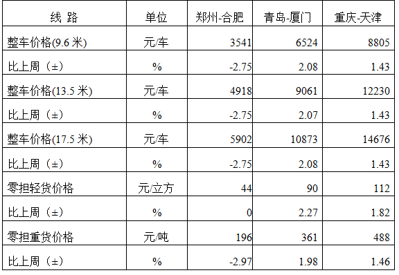 分車型看,各車型指數環比小幅回升。其中,整車指數為1040.40點,比上周回升1.23%;零擔輕貨指數為1027.19點,比上周回升1.31%;零擔重貨指數為1039.94點,比上周回升1.23%。