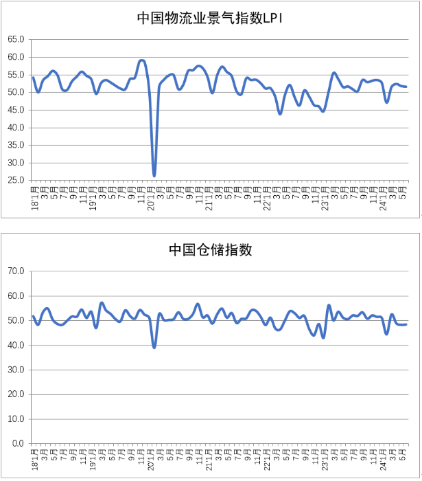 中國(guó)物流與采購(gòu)聯(lián)合會(huì)發(fā)布的2024年6月份中國(guó)物流業(yè)景氣指數(shù)為51.6%,較上月回落0.2個(gè)百分點(diǎn);中國(guó)倉(cāng)儲(chǔ)指數(shù)為48.5%,較上月回升0.1個(gè)百分點(diǎn)。