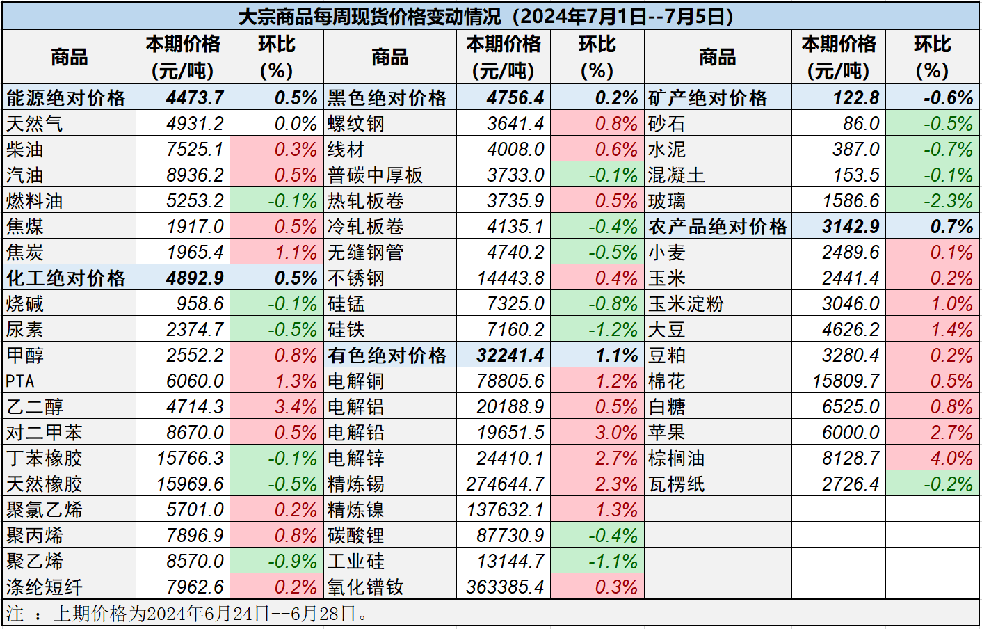 本表所示大宗商品價(jià)格(類別與產(chǎn)品規(guī)格說(shuō)明見(jiàn)附表)為以人民幣計(jì)價(jià)的現(xiàn)貨價(jià)格(包含流通費(fèi)用、利潤(rùn)和稅費(fèi)等)。計(jì)算這些價(jià)格時(shí)使用的信息來(lái)源,主要包括國(guó)內(nèi)重點(diǎn)地區(qū)的生產(chǎn)商、貿(mào)易商及下游消費(fèi)企業(yè)之間的成交、詢報(bào)盤(pán)及可成交價(jià)格。價(jià)格單位為人民幣元/噸。
