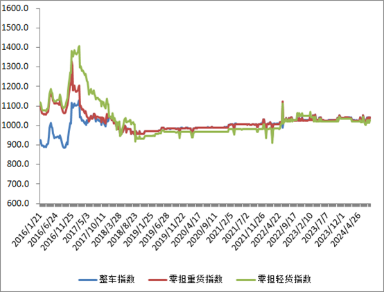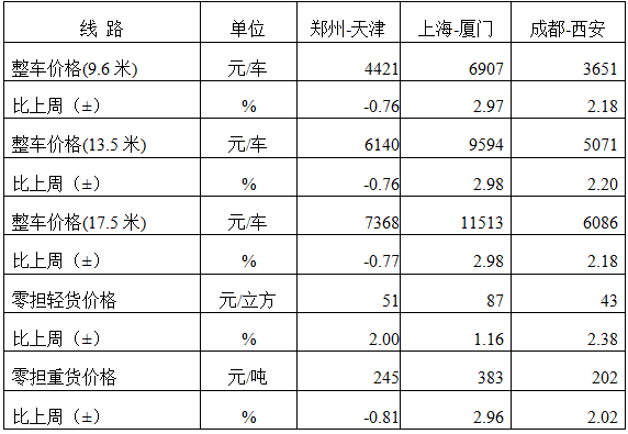 分車型看,各車型指數環比有所回升。其中,整車指數為1043.01點,比上周回升1.32%;零擔輕貨指數為1027.47點,比上周回升1.28%;零擔重貨指數為1042.56點,比上周回升1.31%。