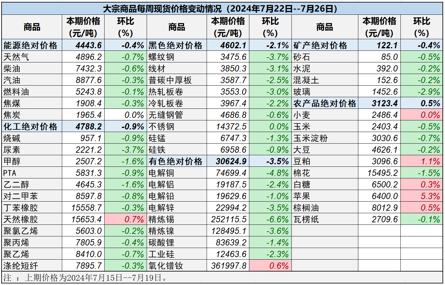 本表所示大宗商品價格(類別與產品規格說明見附表)為以人民幣計價的現貨價格(包含流通費用、利潤和稅費等)。計算這些價格時使用的信息來源,主要包括國內重點地區的生產商、貿易商及下游消費企業之間的成交、詢報盤及可成交價格。價格單位為人民幣元/噸。
