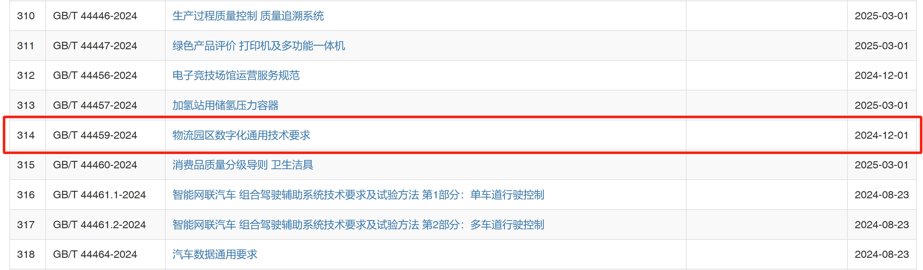 2024年8月23日,國家市場監督管理總局、國家標準化管理委員會批準發布335項國家標準,其中包括由全國物流標準化技術委員會提出并歸口《物流園區數字化通用技術要求》(GB/T 44459-2024)和《倉單要素與格式要求》(GB/T 30332-2024)兩項國家標準。