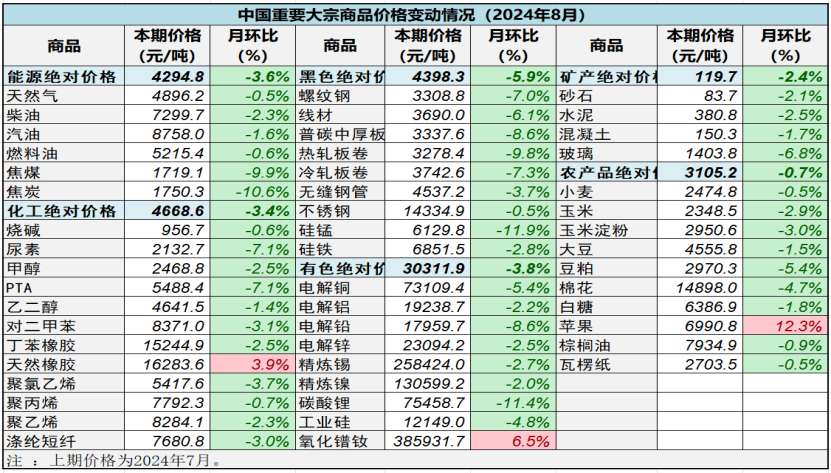 分商品看:在中國物流與采購聯(lián)合會(huì)重點(diǎn)監(jiān)測的50種大宗商品中,本月價(jià)格與上月相比,47種(94%)大宗商品價(jià)格下跌,3種(6%)大宗商品價(jià)格上漲。其中,漲幅前三的為蘋果、氧化鐠釹和天然橡膠,月環(huán)比分別上漲12.3%、6.5%和3.9%;跌幅前三的大宗商品為硅錳、碳酸鋰和焦炭,月環(huán)比分別下跌11.9%、11.4%和10.6%。