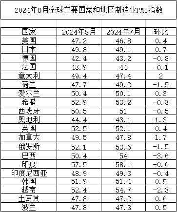 2024年8月全球主要國家制造業PMI