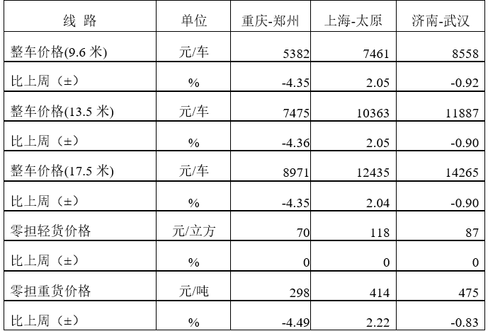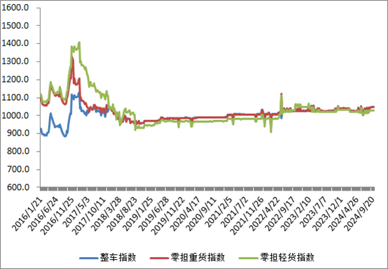 分車型看,各車型指數環比略微回落。其中,整車指數為1048.15點,比上周回落0.05%;零擔輕貨指數為1028.62點,與上周基本持平;零擔重貨指數為1048.74點,比上周回落0.03%。