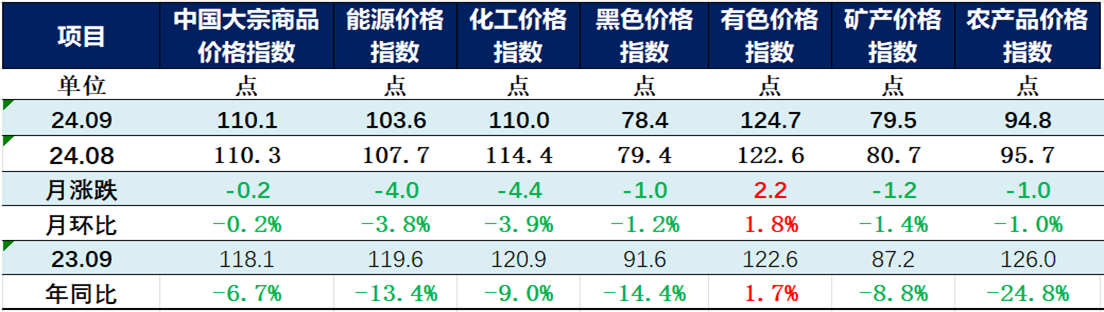 由中物聯大宗分會和上海鋼聯等單位聯合調查,中國物流與采購聯合會發布的2024年9月份中國大宗商品價格指數(CBPI)為110.1點,環比小幅回落0.2%,同比下跌6.7%。從指數運行情況來看,9月份CBPI受市場需求回暖、央行降息降準等影響,多數大宗商品價格自低位反彈,指數跌幅較上月大幅縮窄3.4個百分點。四季度預計隨企業生產經營活動回升,市場信心增強,以及貨幣和財政政策逆周期調節力度加大,經濟回穩向好基礎有望進一步鞏固。從國內外大宗商品指數走勢來看,全球貨幣政策從緊縮周期轉向寬松周期,將有利于擴大市場需求,促進企業投資,并對大宗商品價格形成支撐。