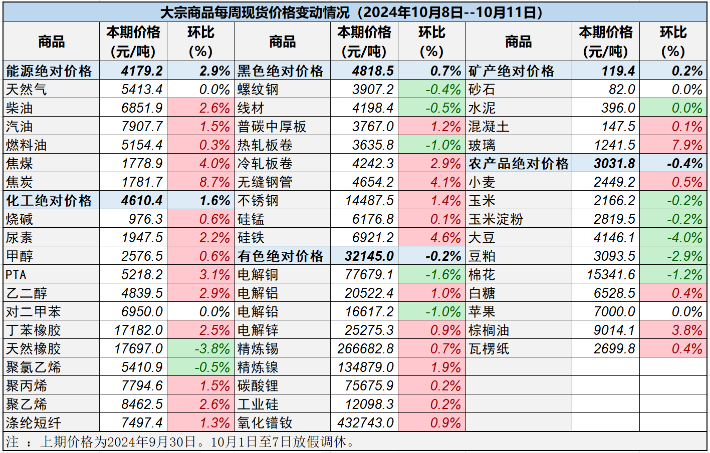 本表所示大宗商品價格(類別與產品規格說明見附表)為以人民幣計價的現貨價格(包含流通費用、利潤和稅費等)。計算這些價格時使用的信息來源,主要包括國內重點地區的生產商、貿易商及下游消費企業之間的成交、詢報盤及可成交價格。價格單位為人民幣元/噸。
