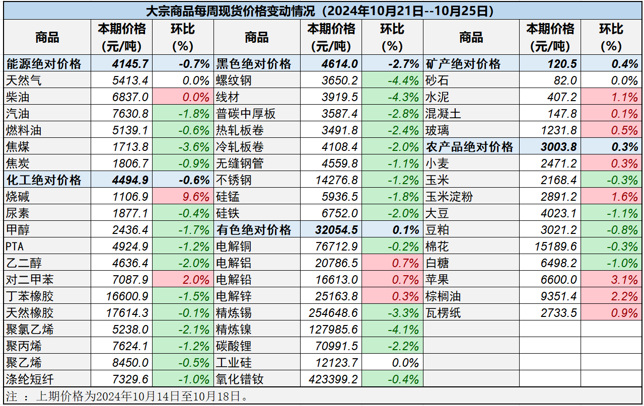 本表所示大宗商品價格(類別與產品規格說明見附表)為以人民幣計價的現貨價格(包含流通費用、利潤和稅費等)。計算這些價格時使用的信息來源,主要包括國內重點地區的生產商、貿易商及下游消費企業之間的成交、詢報盤及可成交價格。價格單位為人民幣元/噸。