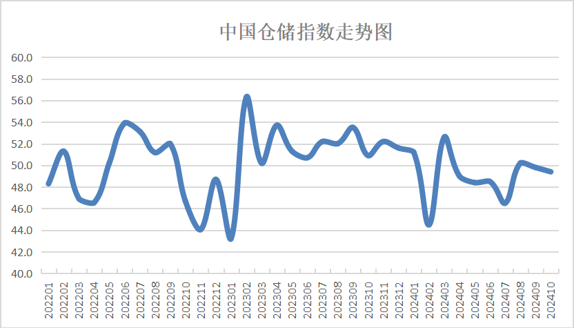 中國物流與采購聯合會和中儲發展股份有限公司聯合調查的中國倉儲指數,2024年10月份為49.4%,較上月回落0.4個百分點,仍運行在收縮區間。新訂單指數、平均庫存周轉次數指數有所下降,收費價格指數、期末庫存指數仍在50%以下,顯示由于倉儲業務需求放緩,加上國慶長假因素擾動,倉儲行業運行壓力加大,租金價格有所下滑,庫存水平持續回落。但庫存周轉保持活躍,企業預期較為樂觀,積極政策正在推動,后期行業具備企穩運行的基礎。具體來看,本月指數有以下幾個特點: