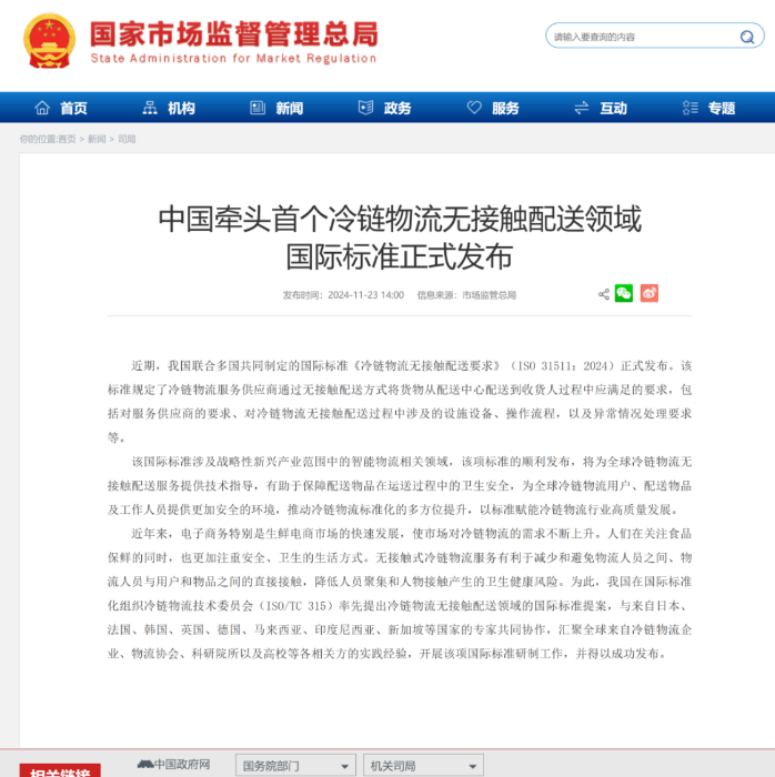 2024年11月,《冷鏈物流無接觸配送要求》(ISO 31511:2024)國際標準正式發布,這是由中國提出的在冷鏈物流領域發布的首個國際標準。該標準提案是由中國物流與采購聯合會組織中國標準化研究院等單位在國際標準化組織冷鏈物流技術委員會(ISO/TC 315)率先提出。