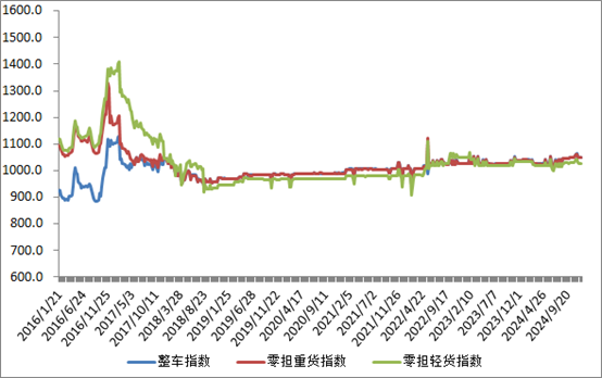 分車型看,各車型指數環比有所回落。其中,整車指數為1049.27點,比上周回落0.01%;零擔輕貨指數為1027.72點,比上周回落0.05%;零擔重貨指數為1048.92點,比上周回落0.20%。