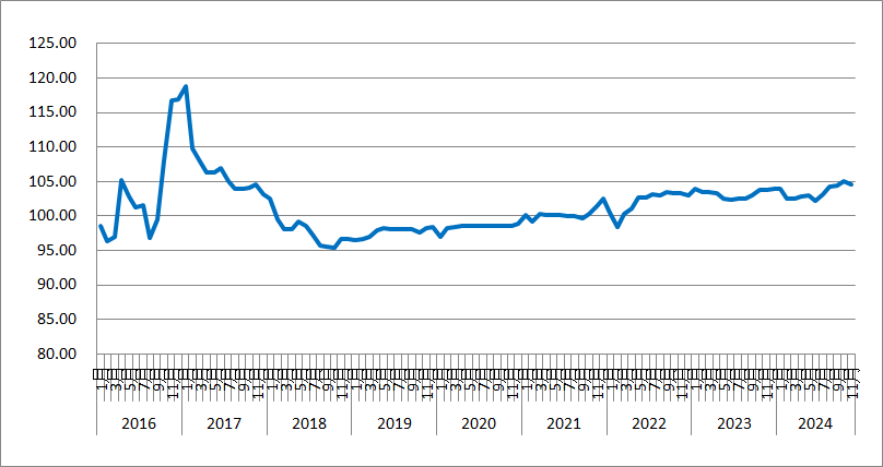 2024年11月份,由中國物流與采購聯合會和林安物流集團聯合調查的中國公路物流運價指數為104.6點,比上月回落0.48%,比去年同期回升0.75%。從周指數看,第二、三、五周運價指數環比回落,第一、四周運價指數環比回升。