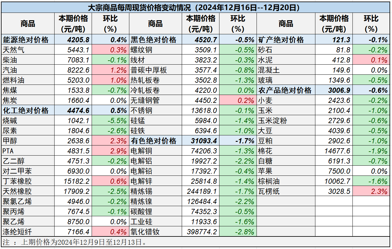 據(jù)中國物流與采購聯(lián)合會對全國50種重要大宗商品市場價格調(diào)查顯示,本期價格(2024年12月16日至12月20日)與上期價格相比,35種(占比70%)大宗商品價格下跌,10種(占比20%)價格上漲,5種(占比10%)價格持平。