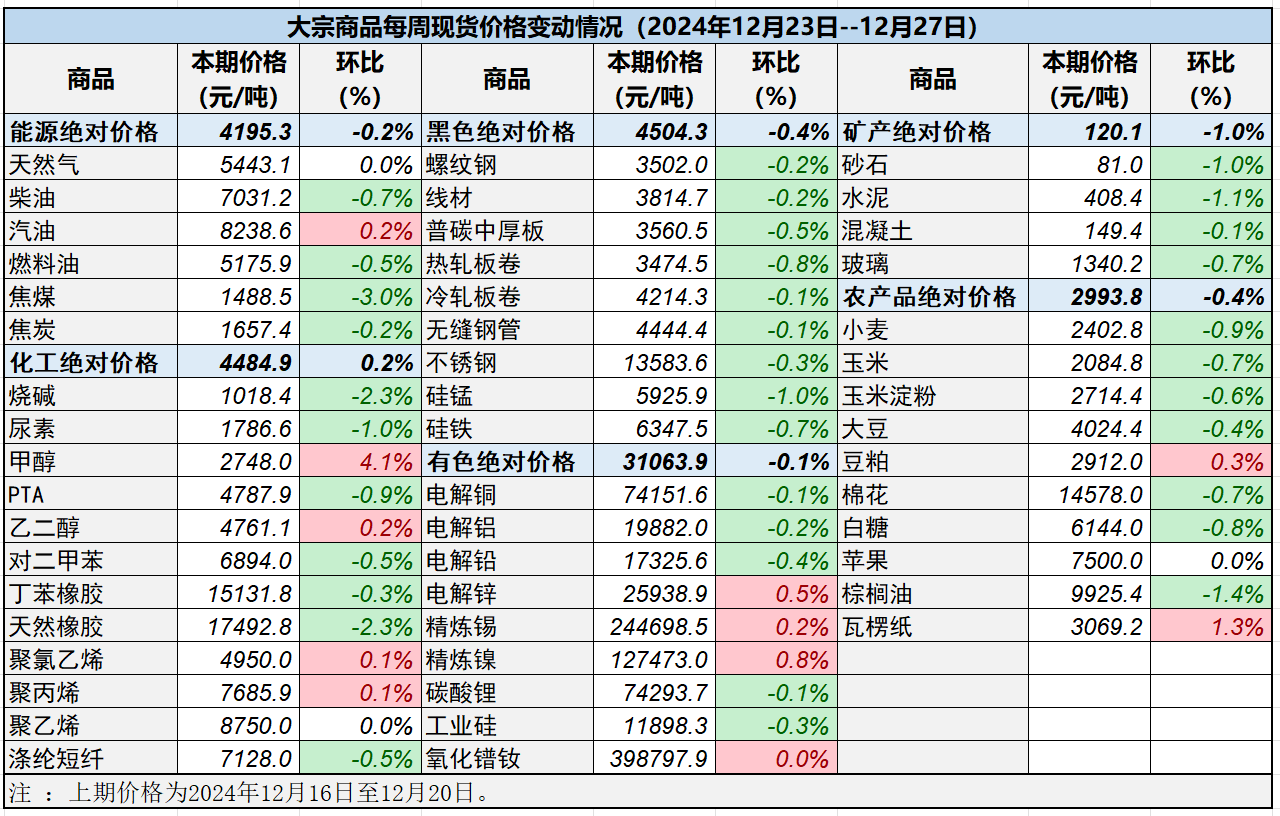 據中國物流與采購聯合會對全國50種重要大宗商品市場價格調查顯示,本期價格(2024年12月23日至12月27日)與上期價格相比,36種(占比72%)大宗商品價格下跌,11種(占比22%)價格上漲,3種(占比6%)價格持平。