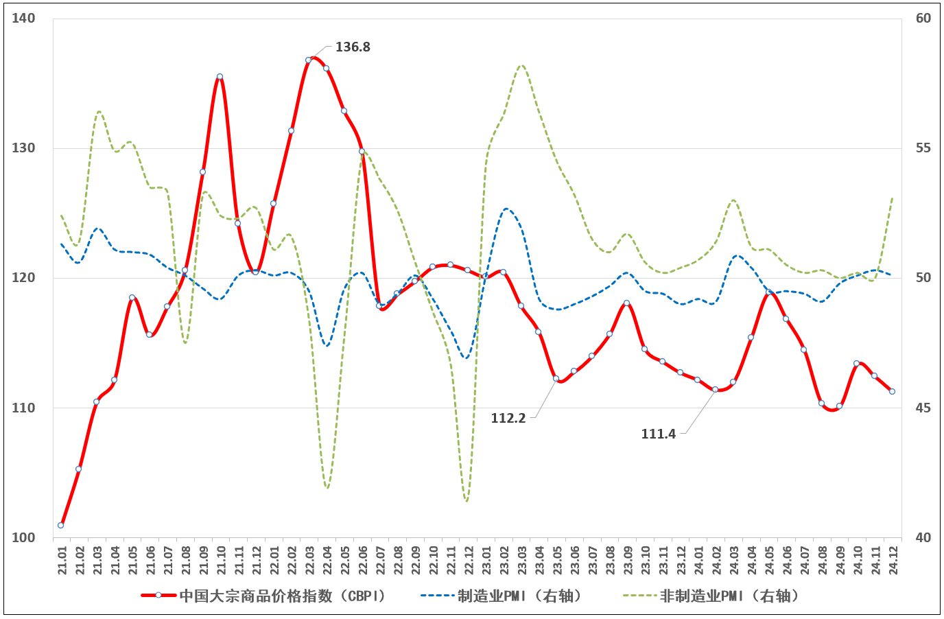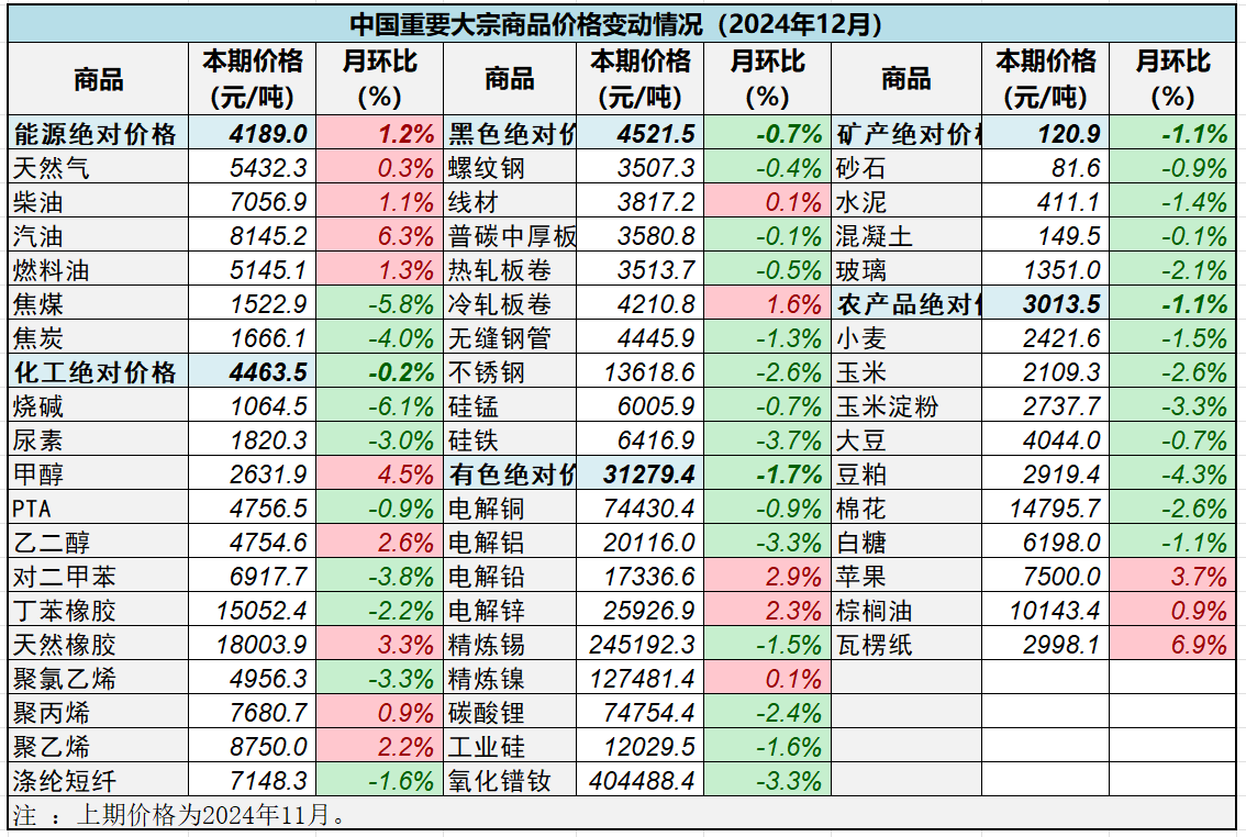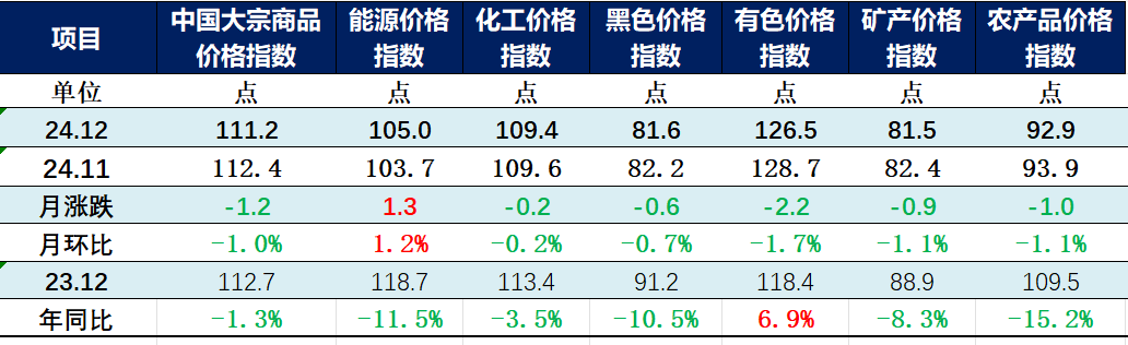 由中物聯大宗分會和上海鋼聯等單位聯合調查,中國物流與采購聯合會發布的2024年12月份中國大宗商品價格指數(CBPI)為111.2點,環比回落1%,同比下跌1.3%。從指數運行情況來看,受外部環境變化不利影響加深,以及傳統消費淡季等影響,指數出現小幅回調,但高于年內低點,表明大宗市場整體運行平穩,多數行業對后市持樂觀預期,隨一攬子增量政策落地見效,經濟穩中向好態勢有望進一步延續,市場價格下行空間有限。展望2025年,全球經濟和經貿政策仍存在較多不確定性,但隨超常規逆周期調節政策加快落地,經濟運行積極因素增多,國內需求有望進一步釋放,預計國內經濟將繼續維持相對平穩增長;同時,世界各國更加積極寬松的財政政策和貨幣政策,以及地緣政治緩和預期上升,也對全球大宗市場形成支撐;總體來看,有利因素多于不利因素,全球經濟和大宗市場將略好于2024年。