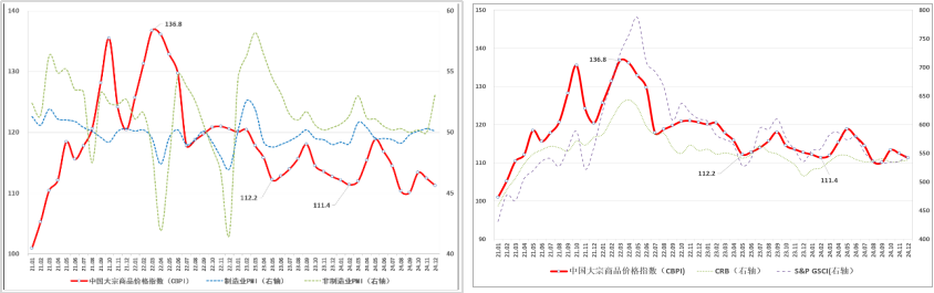 從國內外指數比較看:CBPI與上月PPI、CPI走勢分化。11月PPI環比上漲0.1%;其中,生產資料價格環比上漲0.1%,生活資料價格環比持平。11月CPI環比下降0.6%;其中,食品價格環比下降2.7%,非食品價格環比下降0.1%。CBPI與CRB指數、S&P GSCI指數走勢呈“內弱外強”態勢。主要是受美國經濟軟著陸預期升溫,以及美聯儲放緩降息節奏預期上升等因素影響,全球大宗商品價格走勢分化,黃金、能源價格上漲,基本金屬價格在美聯儲降息后多數走低。