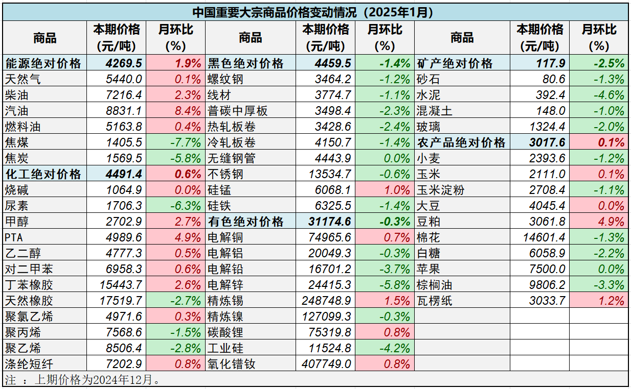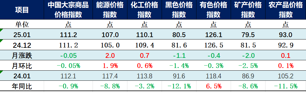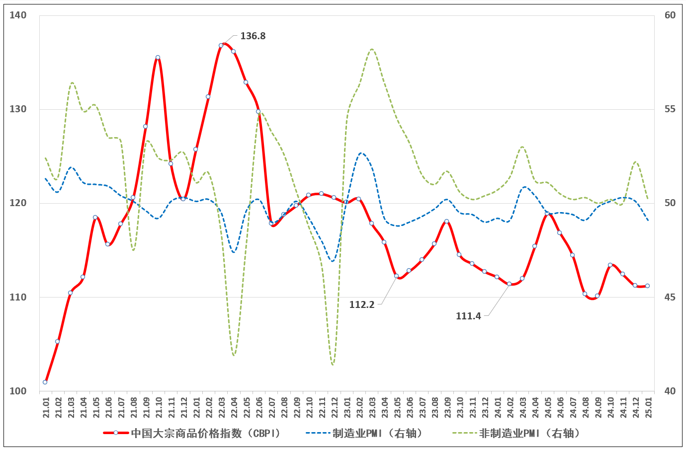 由中物聯(lián)大宗分會(huì)和上海鋼聯(lián)等單位聯(lián)合調(diào)查,中國物流與采購聯(lián)合會(huì)發(fā)布的2025年1月份中國大宗商品價(jià)格指數(shù)(CBPI)為111.2點(diǎn),環(huán)比微跌0.05%,同比下跌0.9%。從指數(shù)運(yùn)行情況來看,受春節(jié)假期影響,指數(shù)略降0.05%,與上月基本持平,但指數(shù)環(huán)比、同比降幅均明顯收窄,且與往年同期比較,回調(diào)幅度也明顯偏小,表明大宗市場新年開局總體平穩(wěn),企業(yè)對節(jié)后市場信心增強(qiáng),后市隨節(jié)后返崗復(fù)工,以及投資和消費(fèi)需求釋放,市場有望逐步回暖。從全球看,盡管當(dāng)前仍面臨貿(mào)易政策和地緣政治等不確定性因素,但全球通脹預(yù)期回落、各國貨幣寬松政策延續(xù),全球經(jīng)濟(jì)增長正逐漸趨于穩(wěn)定。總體而言,支撐我國大宗市場平穩(wěn)健康發(fā)展的積極因素逐漸增多,經(jīng)濟(jì)穩(wěn)中有進(jìn)態(tài)勢有望進(jìn)一步延續(xù)。