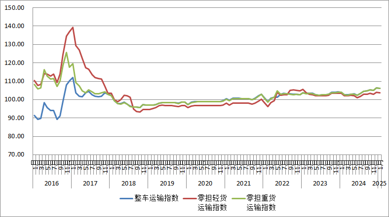 分車型指數看,各車型指數環比小幅回落,同比去年有所增長。以大宗商品及區域運輸為主的整車指數為106.1點,比上月回落0.21%,比上年同期回升1.99%。零擔指數中,零擔輕貨指數為103.8點,比上月回落0.30%,比上年同期回升0.38%;零擔重貨指數為106.1點,比上月回落0.24%,比上年同期回升2.08%。